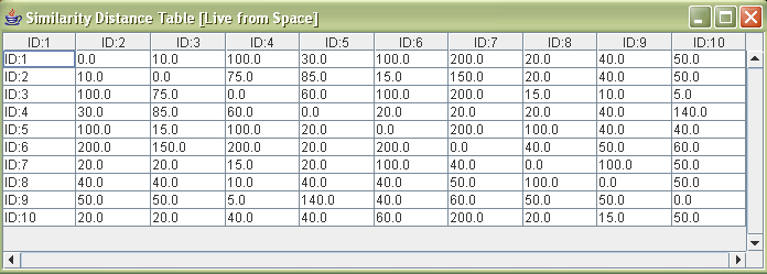 Besides, if users want to see the whole similarity distance values in the space in nice format, users can select "show similarity distance table" in view menu tab. The whole distance values will be put in the matrix to increaser users' readabiity.